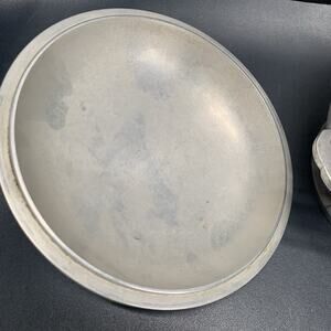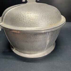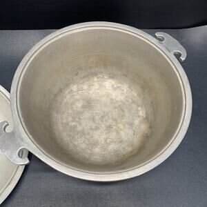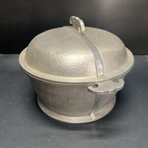 The product is a vintage Guardian Ware Service cast hammered aluminum 10" round roasting pot with lid. This two-piece set includes a flat-bottomed pot with double handles, suitable for use on electric and gas stoves. The pot is made of heavy-duty aluminum and features a silver color with a round shape. Manufactured in the United States during the time period of 1920-1949, this original piece is a great addition to any kitchen collection.