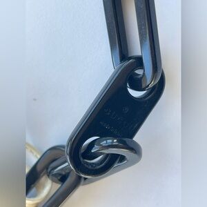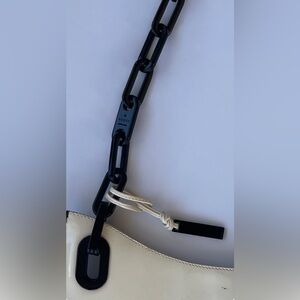 features a chic black lucite chain shoulder strap with contrast black stitching.