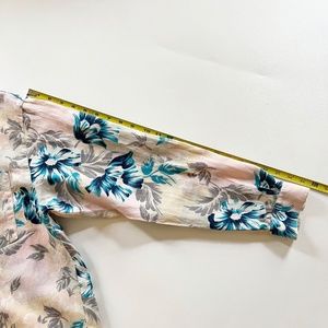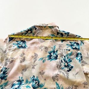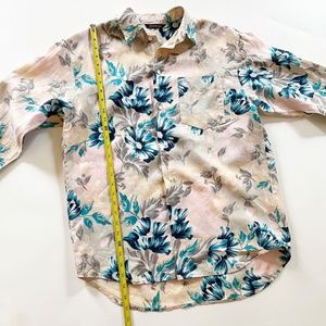 The fabric has a subtle background of squares done in a colors of peach, pink, tan. Vibrant and bold floral print in a teal color is the focus of the design. A classic button front long sleeve shirt with a rounded hem. The ramie fabric has a feel very similar to linen.