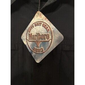 The product is a vintage Marlboro button-down shirt in navy blue, size XXL. It features long sleeves, a collared neckline, a spread collar style, and button closure. Made of nylon and cotton, this shirt is machine washable and suitable for casual occasions. With a rugged, gritty look, this shirt is perfect for men who appreciate classic style with a touch of edgy attitude.