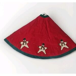 This vintage handmade Christmas felt tree skirt features a retro design with sequins, beads, and embroidery. Measuring 52 inches in diameter, this multicolored skirt is adorned with a festive snowman and star patterns, perfect for adding a touch of charm to your holiday decor. Made in the United States with rickrack, felt, and sequin materials, this unique piece is a timeless addition to your Christmas celebrations.