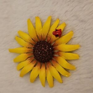 Vtg HEDY Yellow Sunflower Ladybug Painted Metal Brooch
