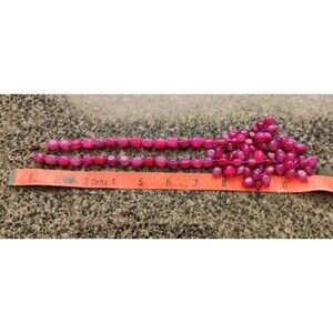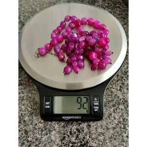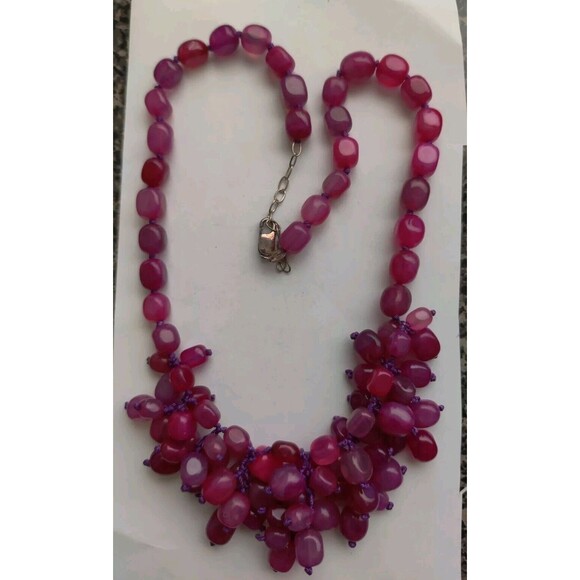 This vintage necklace is a stunning addition to any jewelry collection. The natural hot pink agate stones are beautifully beaded and set on a 925 silver clasp. The necklace is 22 inches long and features an adjustable purple cord chain type.