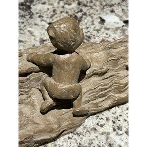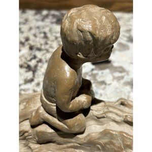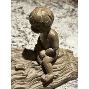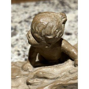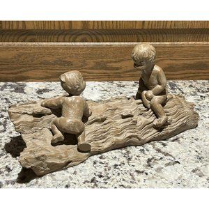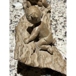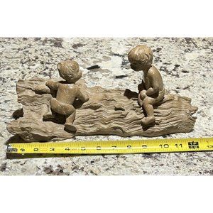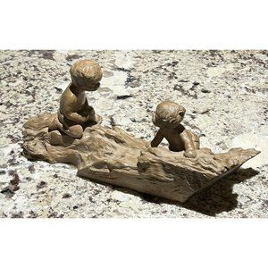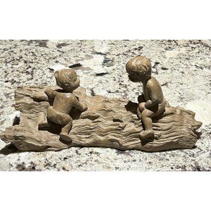 This vintage Haeger Pottery M. Strubel resin sculpture depicts two children playing on a fallen tree, enjoying the outdoors. The sculpture is beautifully crafted with intricate details, showcasing the innocence and playfulness of the children.