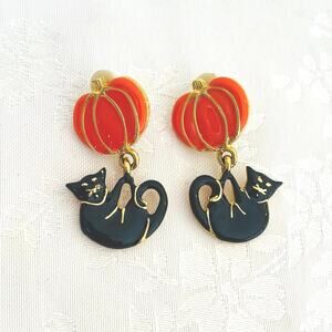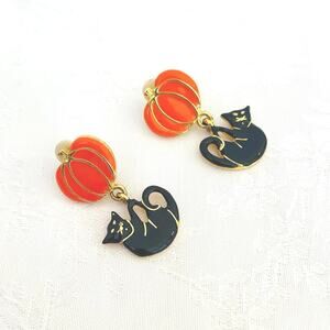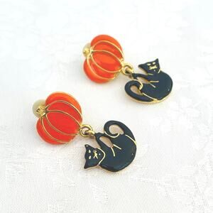 Vintage Halloween Pumpkin Black Cat Dangle Clip-on Earrings Enamel