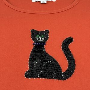 Vtg Halloween Sequin Black Cat Long Sleeve Top XL Petite Orange Kitschy Grandma