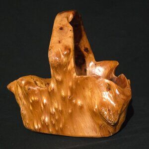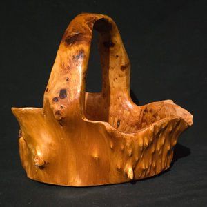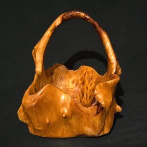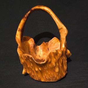 Vtg Hand Carved Handled Burl Wood Basket 9 5/8" L x 7 3/4" W x 9" H