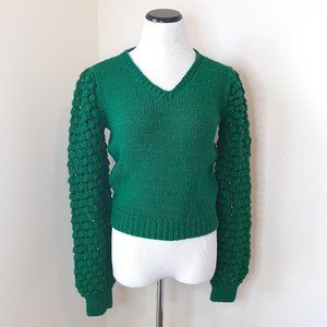 An amazing vintage knit find! Bright solid green hand knit cropped balloon sleeve sweater with ribbed cuffs! I can't say enough about how good this one is!! Flattering crop length with V neck. Open knit style long sleeves that are extra long, so they will puff nicely a the wrist when worn! It's tough to estimate the age of vintage hand knits, but I would put this conservatively in the 90s- but the style is timeless!