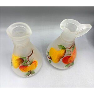 Vtg Hand Painted Gary Fad Frosted Glass Oil & Vinegar Bottle Fruit Design Cruet