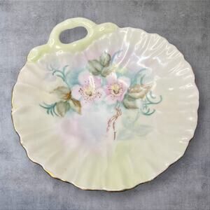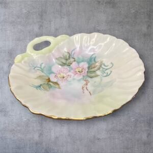 Add charm to your decor or vanity with this vintage porcelain trinket or nut dish, beautifully hand painted with delicate pink plum blossoms and soft greenery. The gently scalloped edge is accented with a gold trim, and the dish features a unique cut-out handle detail. Artist-signed “M. Brown” on the back, adding collectible appeal.