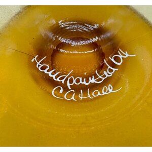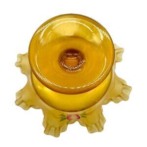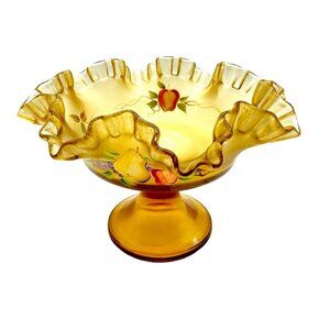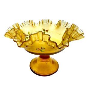 This vintage, hand painted Fenton candy dish boasts a beautiful amber color, adorned with fruit and floral patterns. Signed by the artist, it's 5.5"H x 8"D with crimped edges and made of fine art glass. No flaws detected.