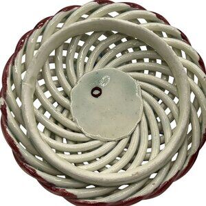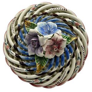 Vintage Hand Painted Spanish Porcelain Trinket Box Woven Twig Style Basket Rose Flowers Made In Spain Open Rope Lattice Weave Cottagecore Bloomcore Chic