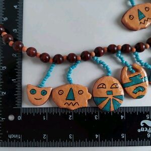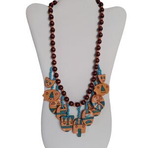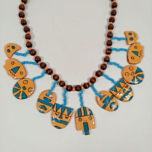 Vtg Hand Painted Wood Face Charm Necklace Southwest Tribal Mask Boho Bead Dangle