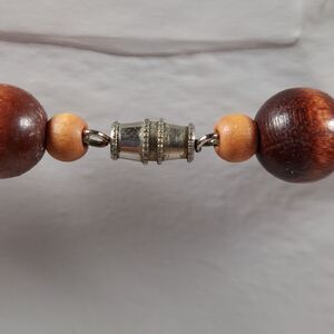 Necklace measures 22 inches long with 2 inch Charm Dangles - Dark Brown Beads and face charms appear to be made from a lightweight wood; Necklace weighs 1.9 oz total.