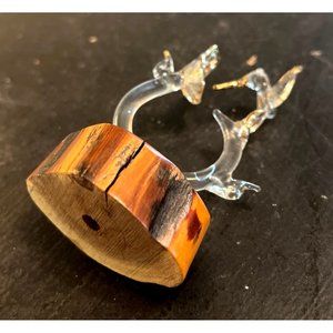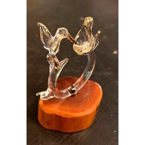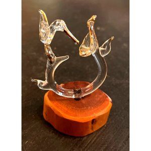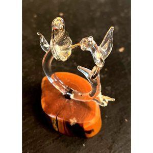 Vtg Handblown Art Glass Humming Bird and Flower on Burl Wood Base with Gold Trim