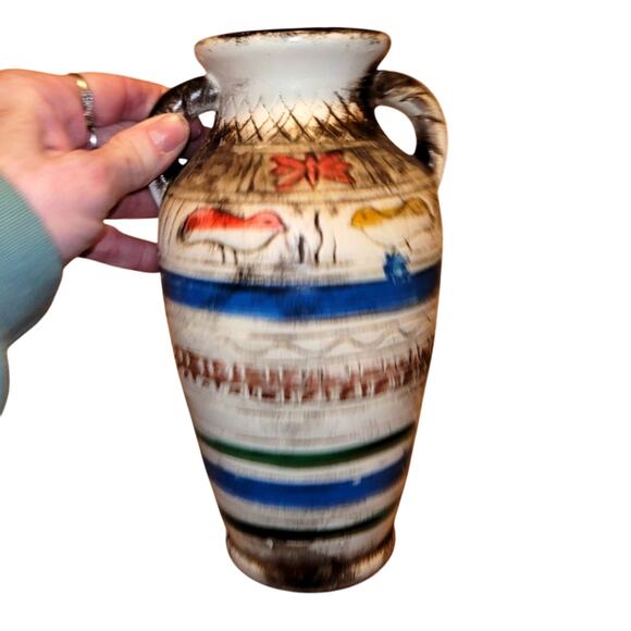 Vtg Handcrafted Ceramic Pottery Vase Folk Art Birds Primative Rustic Farmhouse Southwestern Egyptian Retro Indigenous Style Native American Aztec