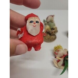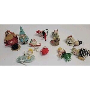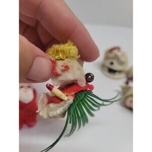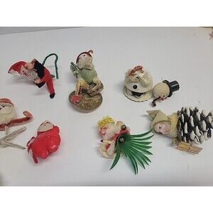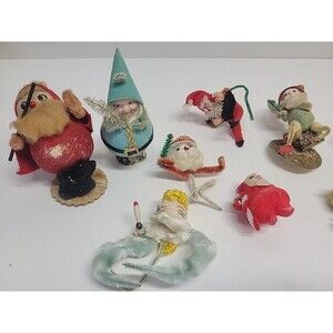 This product is a lot of 10 vintage handmade Christmas elf gnomes and angels made of cotton with pipe-cleaners and pinecones. Manufactured in Japan in the 1950s, these colorful figures are perfect for adding a nostalgic touch to your holiday decor. Each piece is unique and adds a whimsical charm to your Christmas tree or tabletop display.