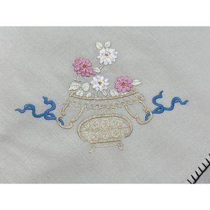 Vintage Handmade Embroidered Needlepoint Small Tablecloth Floral Ribbons Pink Blue 34" x 33"