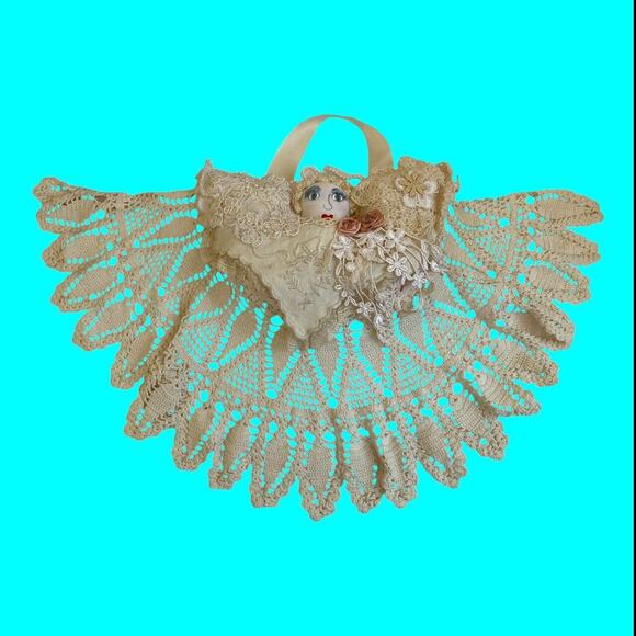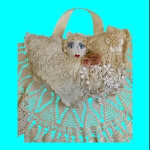 Vtg Handmade Hanging Doll Pin Cushion Crochet Doily Skirt Appliqués Ribbon 20x12