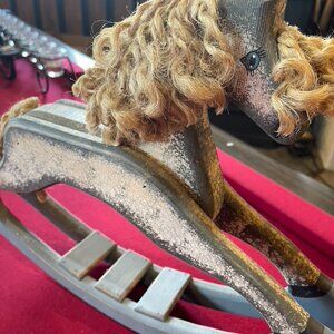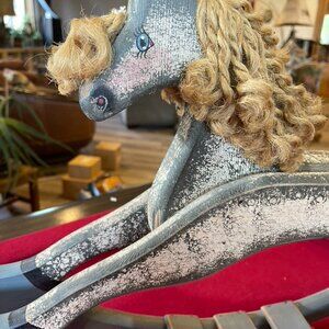 This is a handmade, hand painted, folk art, vintage wooden Appaloosa rocking horse with charming hemp mane and tail in great condition. Great rustic decor. 23 x 15 x 3 inches.