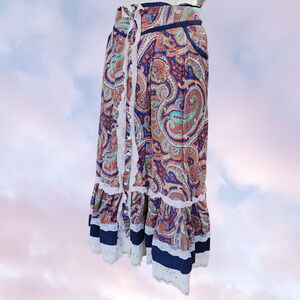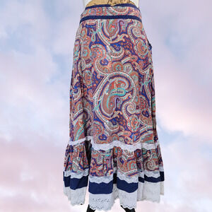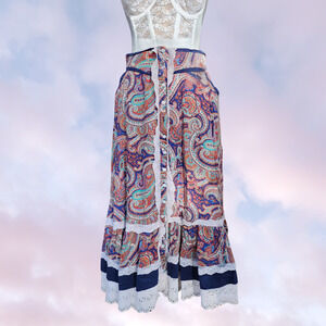 Vintage Handmade Ruffle Paisley Colorful Frill Whimsi Pocket Lace Button Up High Waisted Skirt. This beautiful skirt features two side pockets. Buttons down the center front and has a nice twirl to it while moving around in it. Reminds me of square dance skirts
