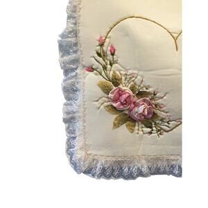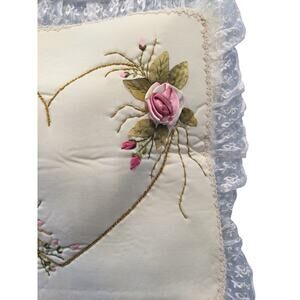 Vtg Handmade Square Pillow Cover Shabby Rose White Pink Heart Lace Valentine Day