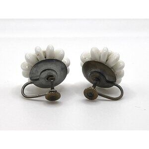 Vintage Handmade White Beaded Floral Bakelite Earrings Made In Germany Non Pierced Screw Back Earrings