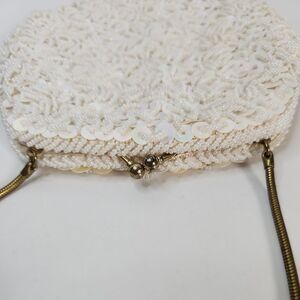 Vtg Handmade White Pearl Bead Sequin Clutch Evening Bag Gold Chain Clasp
