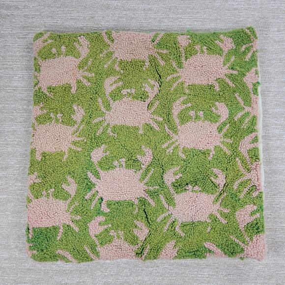 Vtg Handmade Wool Hooked Crab Pillow Cover 18x18 Coastal Nautical Beach Cottage
