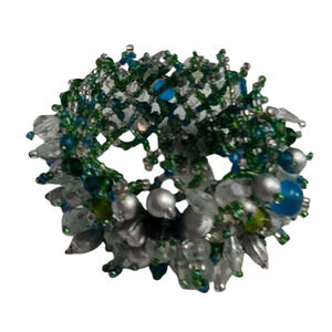 This is a beautiful vintage bracelet, featuring a handwoven design with green beads, faux pearls, and crystal accents.