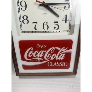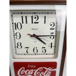 The product is a vintage Hanover Quartz Coca-Cola Classic wall clock with an 18.5" x 12.5" wood frame. This original clock from the 1980s features the iconic Coca-Cola brand and is a unique piece of advertising memorabilia. The clock requires one "AA" battery (not included) to function and is a collectible item perfect for fans of Coca-Cola and vintage advertising. Made in the United States, this classic clock is a must-have for any soda enthusiast's collection.