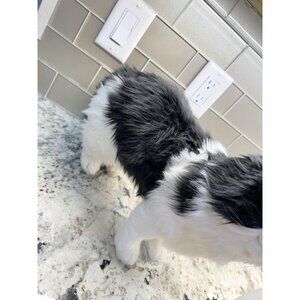The product is a vintage Hansa realistic black and white cat standing life-size soft fuzzy plush toy. This unique and lifelike stuffed animal is perfect for cat lovers or collectors of high-quality plush toys. The realistic design and soft plush material make it a charming addition to any home or collection. Please view all photos as they are part of description including approximate dimensions. This has been stored in a bag and needs to be adjusted and fluffed