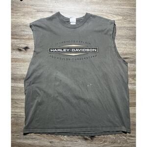 This vintage Harley-Davidson T-shirt combines military pride with motorcycle culture. The distressed finish enhances its vintage appeal, making it a standout piece for collectors and those who appreciate American heritage and patriotism. Ideal for motorcycle enthusiasts or anyone looking to show support for the POW/MIA cause.
