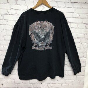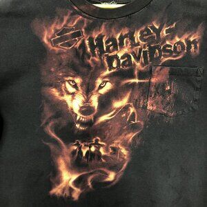 The product is a vintage Harley Davidson shirt featuring wolf flames in a Y2K style grunge design. The size of the shirt is 2XL, making it a larger fit for a comfortable wear. With the iconic Harley-Davidson make, this shirt is a collectible item perfect for fans of American motorcycles and the brand's history. The graphic design and style give it a unique and nostalgic appeal, fitting in with the grunge aesthetic of the late 90s and early 00s.