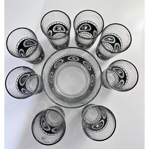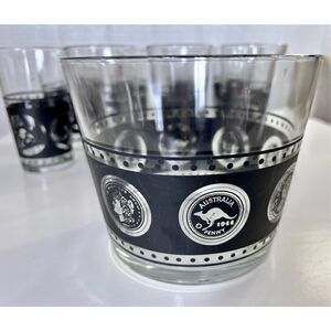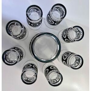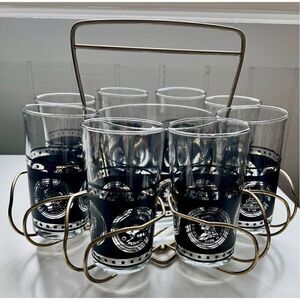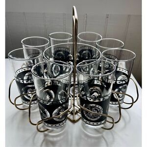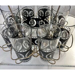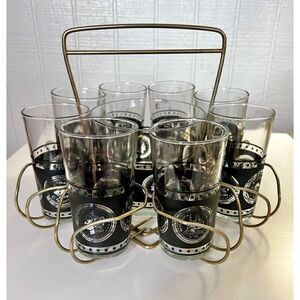 Vtg Hazel Atlas Coins Of the World 8 Glasses, Ice Bucket Black Gold & Caddy MCM