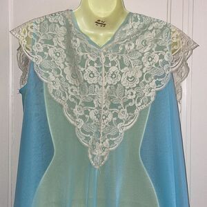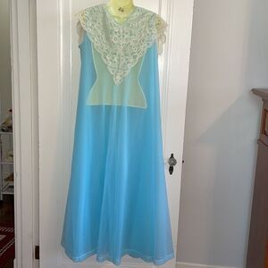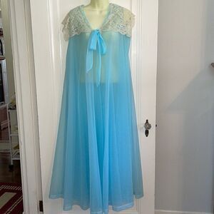 Vintage Henson Kickernick light blue sleeveless double layer nylon robe with cream lace collar that ties at neck