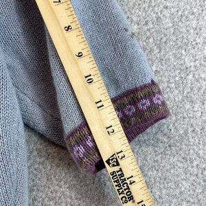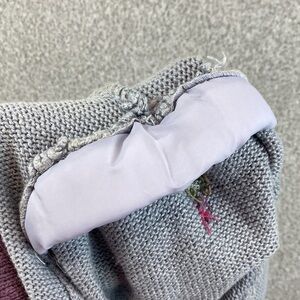 Gorgeous, hand embroidered cardigan. Padding to create lift in the slightly puffed short sleeve. Irridescent buttons. Contrasting fair isle trim. Neutral gray with pink and purple detailing. Subtle stain or fade spot noted near one underarm. Hand wash in cold. Lay flat to dry.