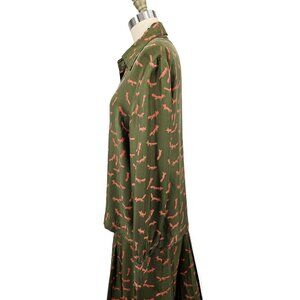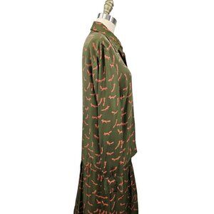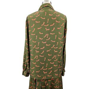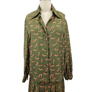 Vtg Hermes Sport Silk Blouse and Pleated Skirt Womens M/L? Fox Print Green