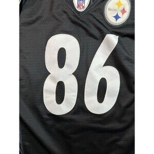 The product is a vintage Hines Ward #86 Pittsburgh Steelers jersey in size medium, made by Reebok and officially licensed by the National Football League (NFL). This black jersey is perfect for male fans of the Pittsburgh Steelers, featuring the player's name and number on the back. Represent your favorite team and player with this classic and authentic fan apparel.