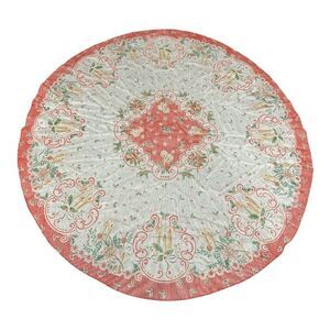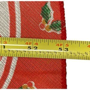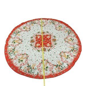 Vintage Print Christmas Tablecloth 53” Round Santa Holly Candles Red Green Gold on a White Background with Red Patterned Edge.