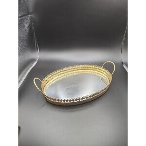 Vtg Hollywood Regency Gold Toned Filigree Oval Vanity Mirror Tray 9.25"