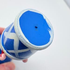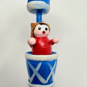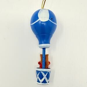 This vintage Christmas ornament features a 4" wooden hot air balloon white, and blue. Manufactured in the 1990s, this small tree ornament is perfect for adding a nostalgic touch to your holiday decor. The hanging design makes it easy to display, and the multicolor pattern adds a festive touch to your Christmas tree. Made of wood, this unique ornament is a charming addition to any holiday collection.