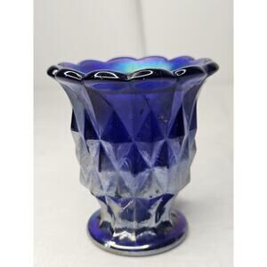 The product is a vintage Imperial cobalt carnival glass diamond block Aurora jewel toothpick holder. This item features a beautiful blue color and belongs to the carnival glass production style. The intricate design and unique style make it a beautiful and decorative piece for any collector of pottery and glass items. The toothpick holder adds a touch of nostalgia and charm to any table setting or display.