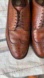 Elegant Floreshim Oxfords in rich tan leather. Perfect for formal occasions. Classic wingtip, brogue, and perforated detailing. Goodyear construction, these have been completely resoled on the interior and have addition comfort some at the heel.