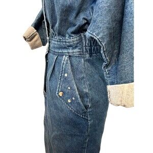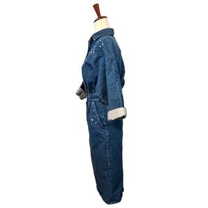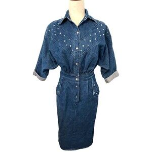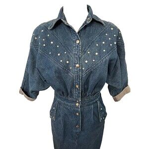 Vintage jean dress by In-tice-ment. Super cute cut with elastic at the waist and snap front closure. Sparkling rhinestones adorn the front in a V pattern and at the hip pockets. Midi length with dolman 3/4 length sleeves. Made of 100% Cotton denim.
