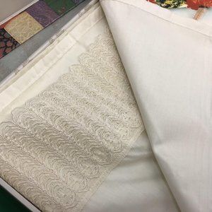 Cream lace, cream linen color.. Never used still in original box and protective tissue vintage Italian fine linen rectangular top sheet edged with a 5 inch macrame lace border and a plain matching flat bottom sheet that is undecorated and as in Europe, no elastic corners. The top sheet is meant to fold down over the bedspread with the lace border showing for decoration. There is no pillowcase (the stock photo is to show design of lace for this line.. the pillowcases were sold separately- and although the stock photo shows a peach lace- this is the cream lace on cream linen