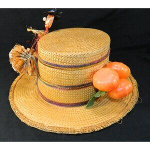 Handcrafted in Italy, this unique vintage straw hat is adorned with a whimsical straw figurine and vibrant what looks like pumpkins accent. A perfect blend of charm and craftsmanship, it adds a playful touch to any collection or outfit.