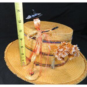 Vtg Italian Straw Hat With Figurine & Accents 1950s Boater Gatsby Autumn Fall