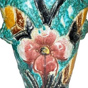 This vintage Italian vase is a true work of art. Its vibrant, multicolor floral pattern is beautifully hand painted on its clay stoneware body, making it a unique decorative piece for any room. The vase features handles that are designed to allow hanging if desired. It is signed by the artist, adding to its charm and authenticity.
