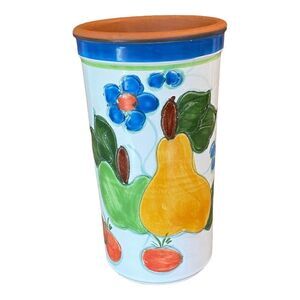 Vtg Italy Utensil Holder Wine Cooler Hand Painted Terracotta Floral Fruit 9.25"